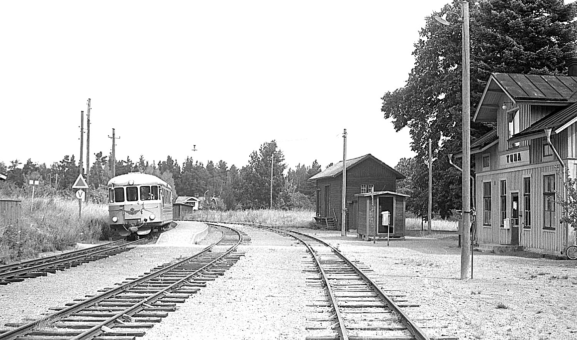 Tuna på banan Västervik–Hultsfred, det var ju enkelt tyckte Anders Eliasson, Fredrik Olsson med flera. Ole Iskov tog bilden av YP 884 med ett utfärdståg den 19 augusti 1973. Den reguljära persontrafiken upphörde 1984, men den 71 km långa banan trafikeras nu sommartid med rälsbussar som denna. Tuna stationshus revs 1980.