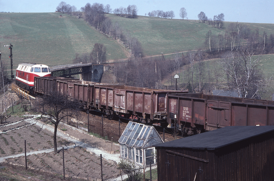 A DR V180 with a rake of empties about to cross a bridge, probably in Thuringia, in 1982. Frank does not remember quite where – can anyone identify the place? Your suggestion is welcome to info@stenvalls.com.